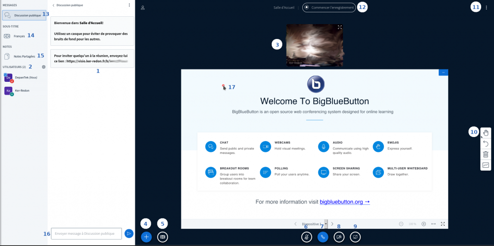Pour partager votre webcam, vous devez cliquer sur le bouton situé en bas de la fenêtre BigBlueButton. Vous pourrez à tout moment cliquer à nouveau sur ce bouton pour suspendre le partage de votre webcam.